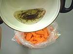 湯通ししたニンジンは冷ましてポリ袋に入れ、冷ましたピクルス液を注ぎいれます。