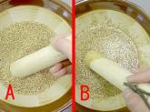 2.ゴマをすり鉢に入れてすります(写真A)。ある程度すったら、漬液の材料を入れて混ぜます(写真B)。