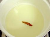 ? 砂糖・水・酢・唐辛子をなべに入れて火にかけて、煮立ったら火をとめて冷まします。(真中の写真)