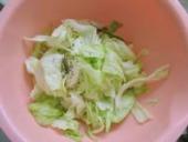 2.大き目のボールに?のキャベツを入れて塩を振り、手でもむ。始めは軽く、だんだん力をいれてしんなりするまでもみます。