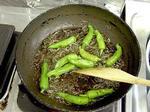 1. フライパンにごま油を入れて熱して小女子を炒め、そこにシシトウを加えて、炒めます。