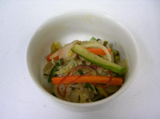 白菜の茎:200g 玉ねぎ:60g にんじん:60g きゅうり:60g 赤唐辛子:1本分 こんぶ:2g 〔漬け材料:酢:50cc ごま油:大さじ2 醤油:大さじ3 砂糖:小さじ2〕