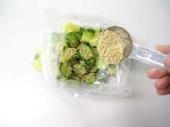 ポリ袋に塩抜きがすんだ糠漬けとたくあんを入れ、ゴマを大さじ1入れます。