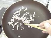 2. ベーコンを細かく刻んで、フライパンでカリカリになるまで炒めます。