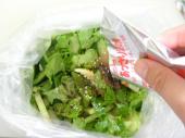 | ポリ袋に刻んだ野菜と醤油、砂糖、みりん、あっさり漬の素を加えてよく混ぜ合わせます。 |