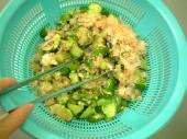 板ずりをしたキュウリは乱切りに、オクラはヘタを切って斜めに切り、ポリ袋に入れます。